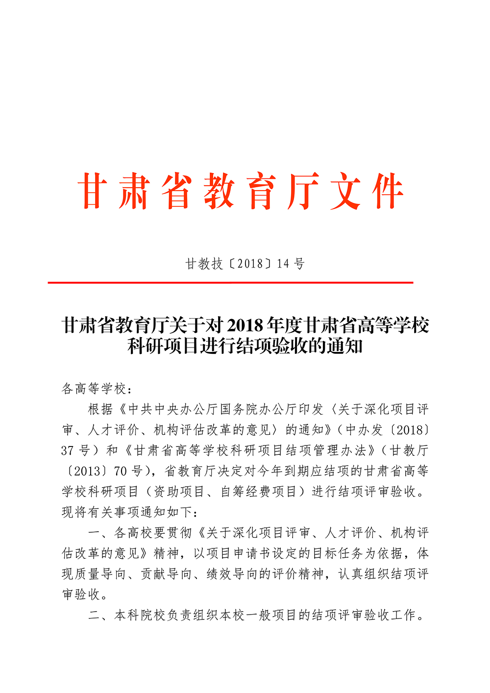 轉(zhuǎn)發(fā)甘肅省教育廳關(guān)于對2018年度甘肅省高等學(xué)??蒲许?xiàng)目進(jìn)行結(jié)項(xiàng)驗(yàn)收的通知