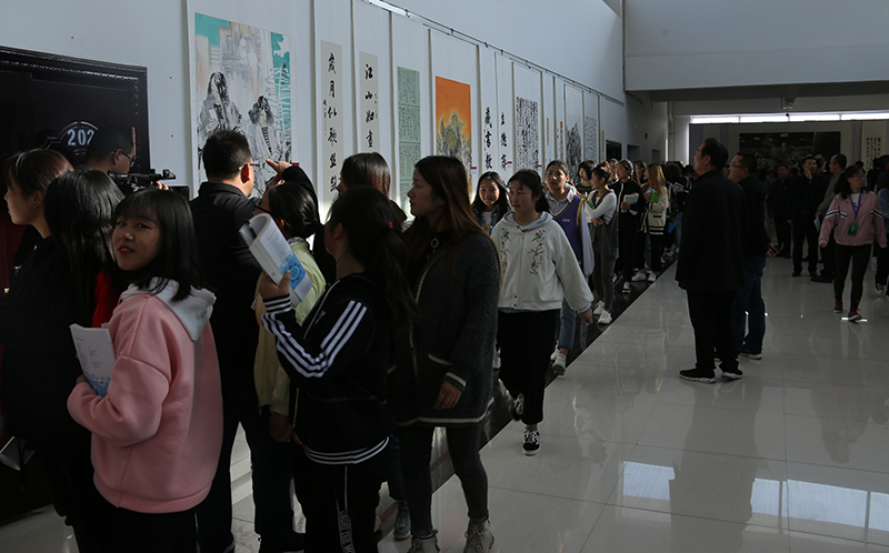 趙明宣布“不忘初心,牢記使命”武威美術書法作品交流展開幕。隨后,學院師生觀看欣賞了展覽作品。