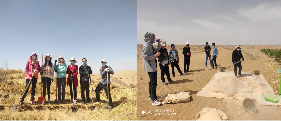 由我院與中科武威新能源研究所合作的淀粉基超級吸水材料在沙漠植保工程示范試驗項目組成員自4月8日起已陸續(xù)赴武威園區(qū)、民勤縣青土湖,涼州區(qū)長城鎮(zhèn)、古浪八步沙等地推廣應(yīng)用工作,陸續(xù)實施壓沙、沙生苗木種植、植被樣點監(jiān)測等,截至目前累計完成壓沙任務(wù)300畝,苗木種植任務(wù)220畝。