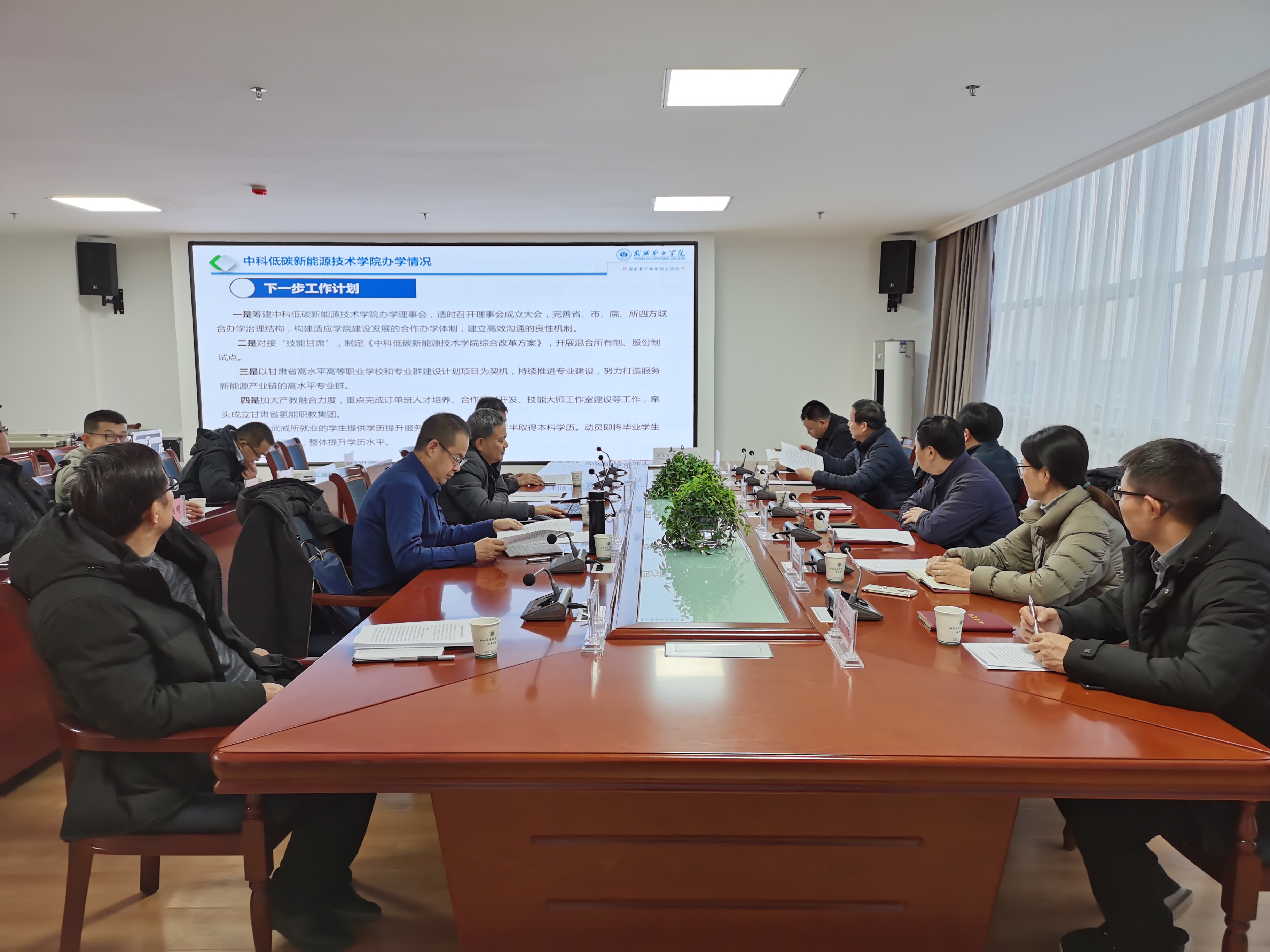 參觀結(jié)束后,學(xué)院在能源科技樓811會議召開了中科低碳新能源技術(shù)學(xué)院工作座談會。會上,趙明介紹了學(xué)院整合教學(xué)資源建設(shè)發(fā)展歷程、黨的建設(shè)、優(yōu)質(zhì)校建設(shè)、專業(yè)建設(shè)、合作辦學(xué)、師資隊伍建設(shè)、招生就業(yè)、科研服務(wù)、對外交流、校企合作和“雙高”院校創(chuàng)建等情況。重點就中科低碳新能源技術(shù)學(xué)院建設(shè)發(fā)展、專業(yè)申報、實驗實訓(xùn)室建設(shè)、教育教學(xué)、人才培養(yǎng)和下一步工作計劃等情況進行了詳細介紹。