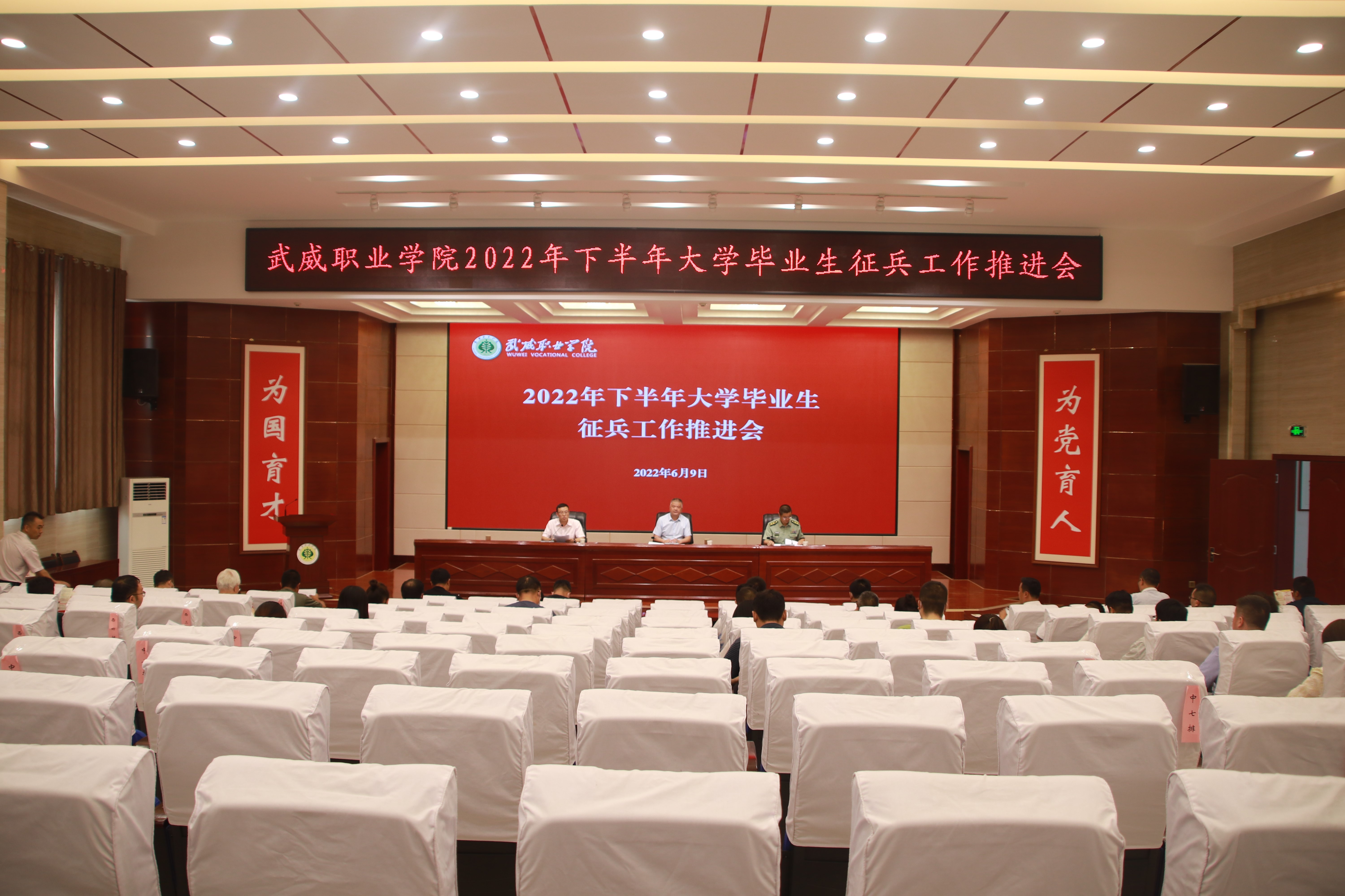 6月9日下午,學(xué)校2022年下半年大學(xué)畢業(yè)生征兵工作推進(jìn)會(huì)在菁英廳召開(kāi),學(xué)校黨委委員、副校長(zhǎng)王守云,涼州區(qū)人武部中校副部長(zhǎng)何志強(qiáng)出席會(huì)議。