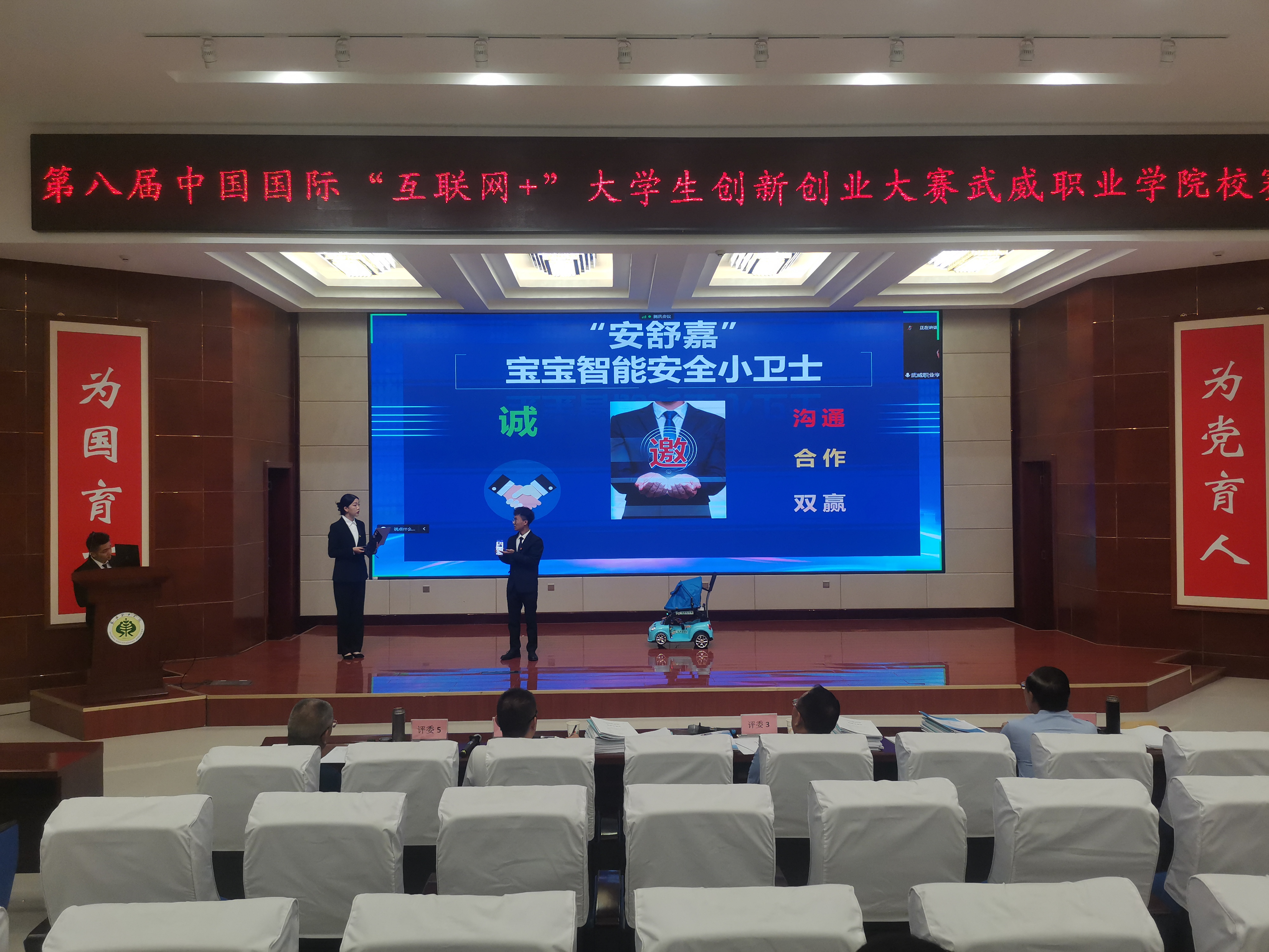 經(jīng)前期專家組初評共47個項目(高教主賽道3項,紅旅賽道14項,職教賽道30項)晉級校級決賽,分為三組分別在菁英廳和篤行樓一樓進行答辯。本次大賽以線上線下混合式評審方式進行。