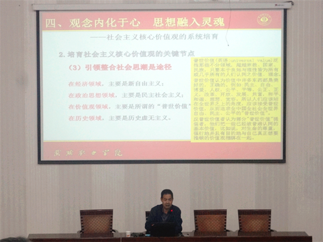 10月20日,我系邀請學院副院長翟存祥教授在學院正德廳為全系師生作了一場題為《如何踐行社會主義核心價值觀》的專題講座,講座由我系黨總支書記晏素珍主持。