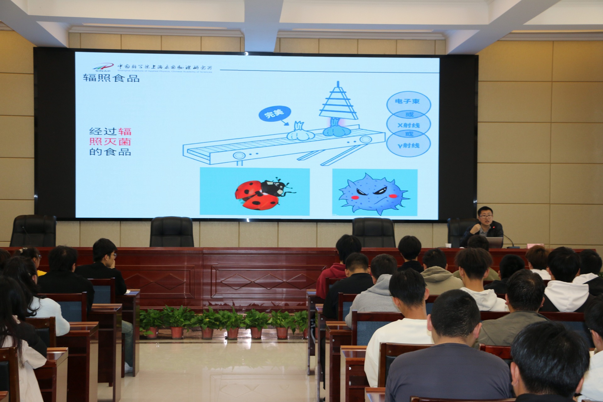 李吉豪做了題為《身入“輻”境,洞悉其益——輻照技術(shù),點亮生活之光》的報告,從輻射技術(shù)概述科普、輻照技術(shù)在農(nóng)業(yè)領(lǐng)域的應(yīng)用、輻照技術(shù)在高分子化工領(lǐng)域的應(yīng)用等三個方面對輻照技術(shù)的前沿應(yīng)用進行了生動的講解,現(xiàn)場師生大受裨益,也讓學(xué)生對自己所學(xué)相關(guān)專業(yè)有了更加深刻的理解,同時激發(fā)了同學(xué)們對專業(yè)知識的學(xué)習(xí)熱情。