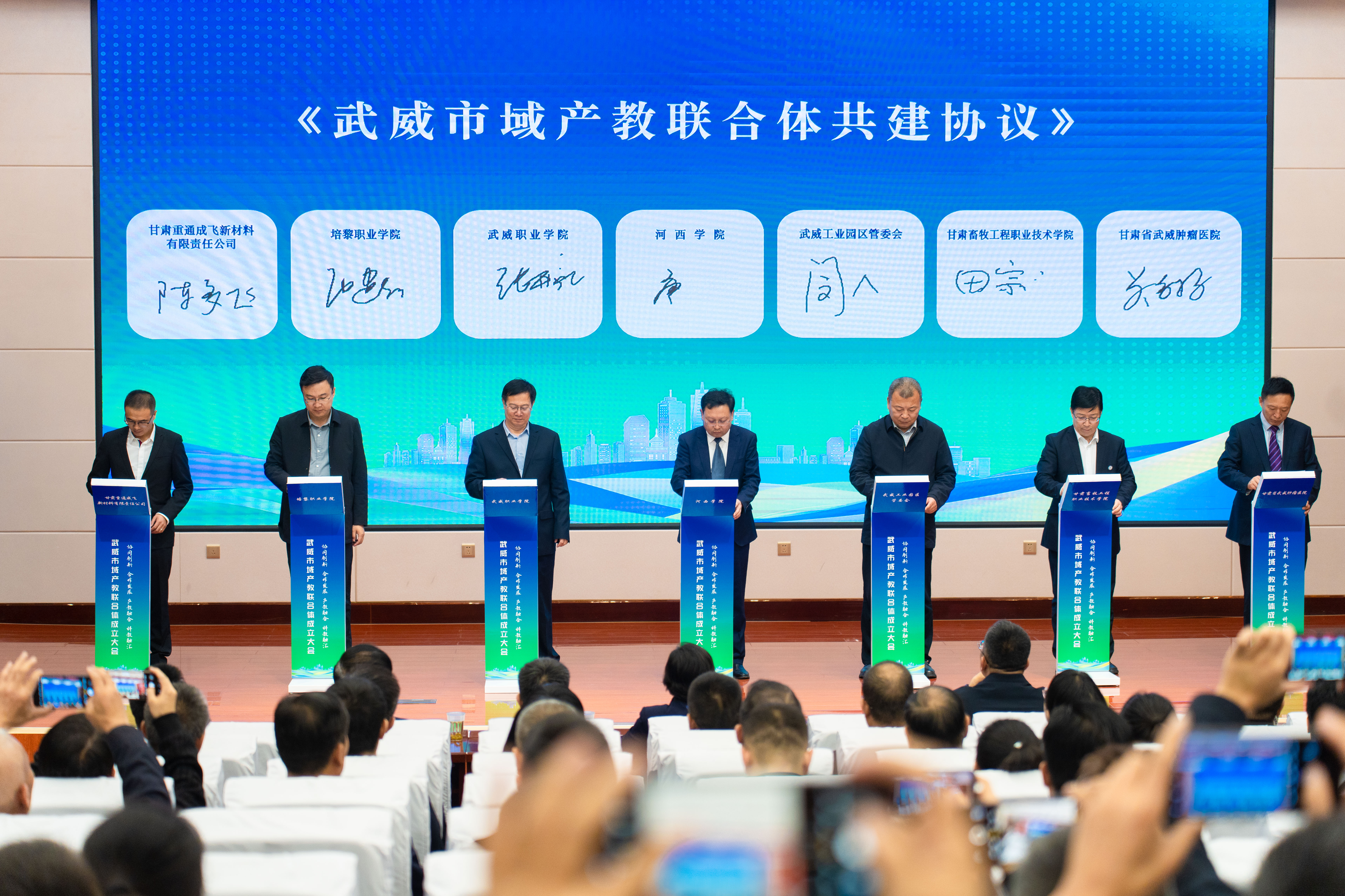 武威市域產(chǎn)教聯(lián)合體是在市教育局、市工信局、市科技局等市級(jí)部門的指導(dǎo)下,由武威工業(yè)園區(qū)、武威職業(yè)學(xué)院、甘肅重通成飛新材料有限責(zé)任公司牽頭,邀請(qǐng)河西學(xué)院、蘭州資源環(huán)境職業(yè)技術(shù)大學(xué)、甘肅畜牧工程職業(yè)技術(shù)學(xué)院、培黎職業(yè)學(xué)院等院校,吸納市域內(nèi)重點(diǎn)企業(yè)、職業(yè)院校、科研院所等多方參與組建。會(huì)前,市教育局、市工信局、市科技局三部門聯(lián)合印發(fā)了《武威市域產(chǎn)教聯(lián)合體建設(shè)方案》。