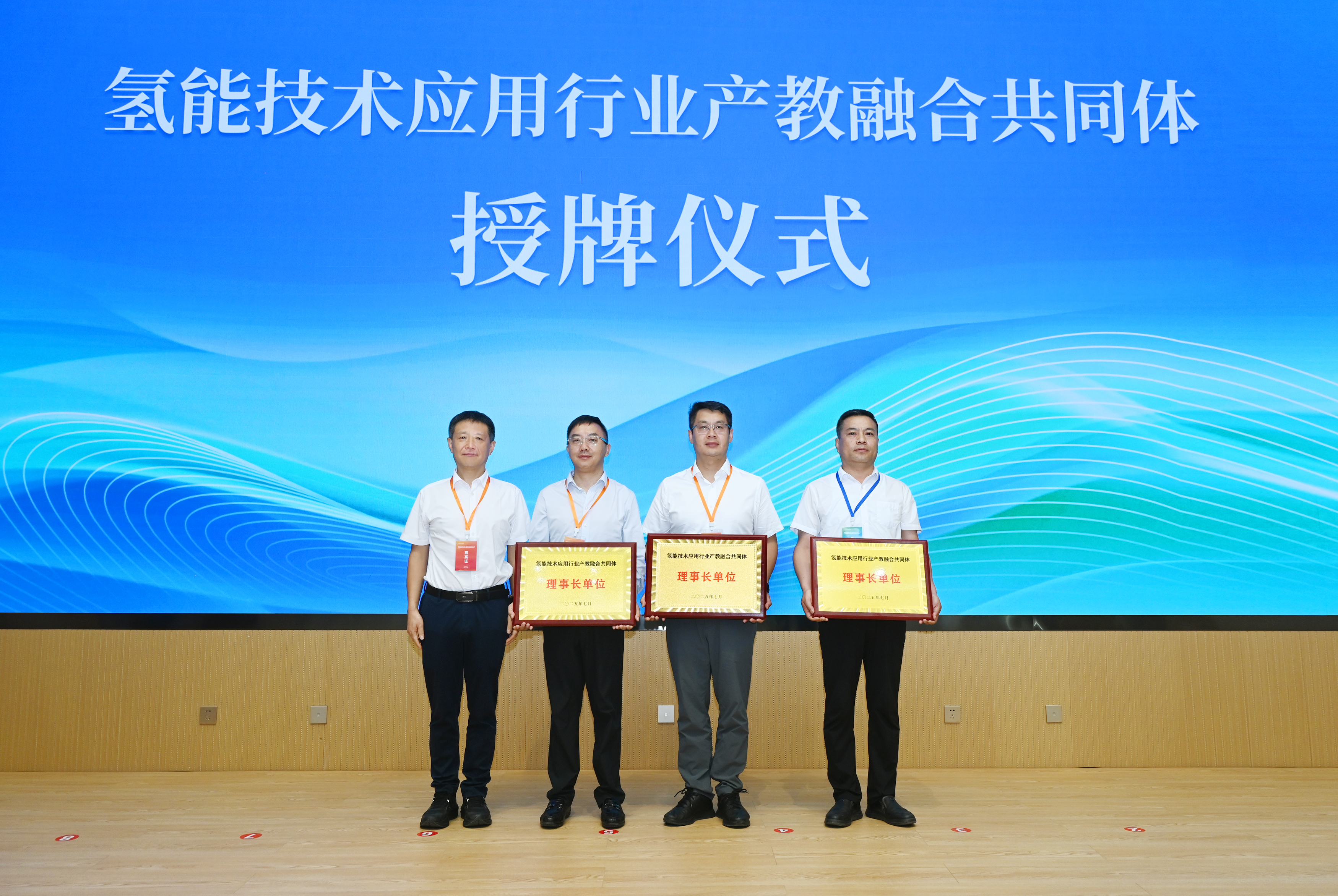 啟動儀式上,與會領(lǐng)導(dǎo)共同點(diǎn)亮啟動球,宣布?xì)淠芗夹g(shù)應(yīng)用行業(yè)產(chǎn)教融合共同體正式成立。大會公布了共同體理事會成員單位名單,并為理事長單位、副理事長單位授牌。