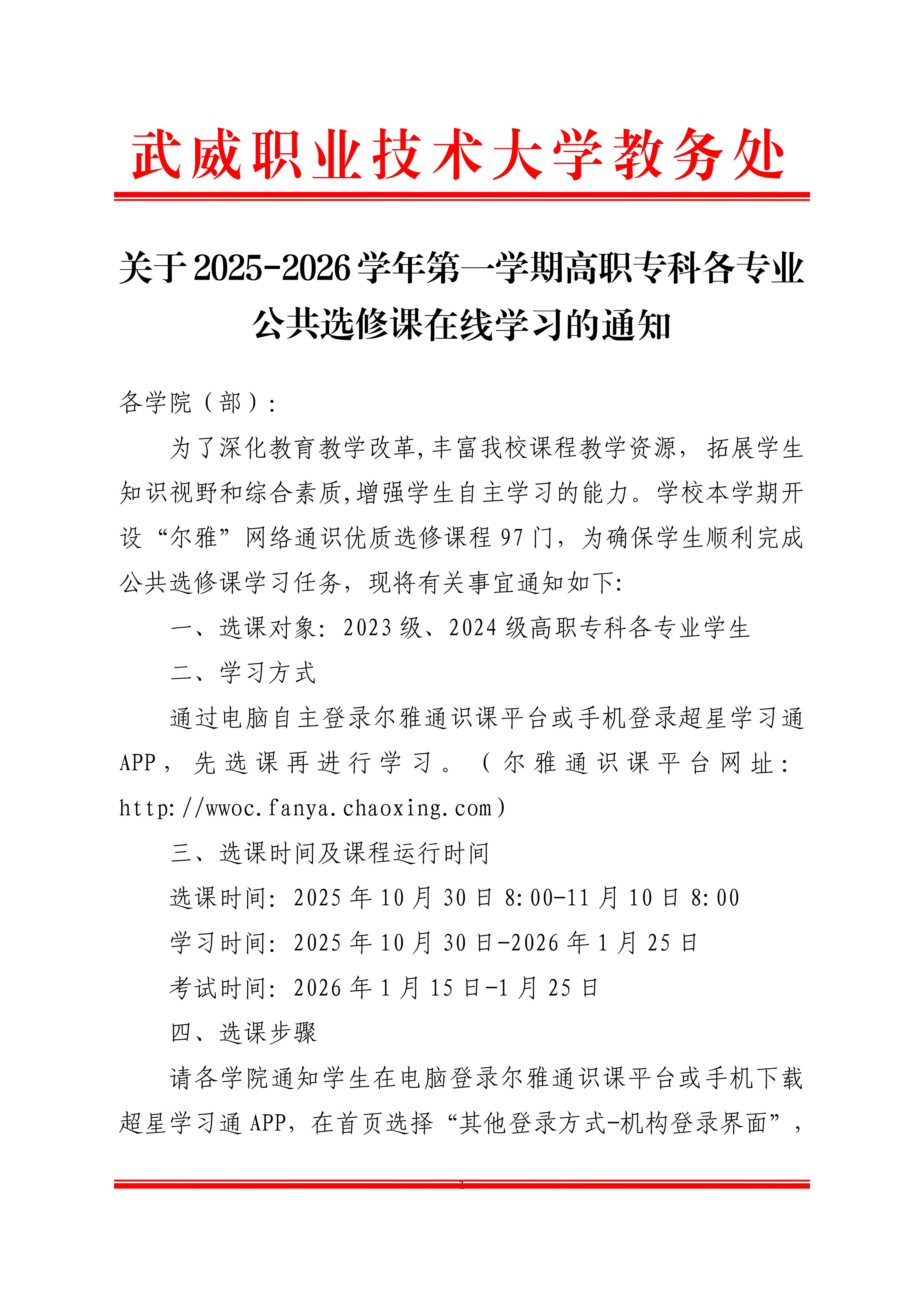 關于2025-2026學年第一學期高職??聘鲗I(yè)公共選修課在線學習的通知
