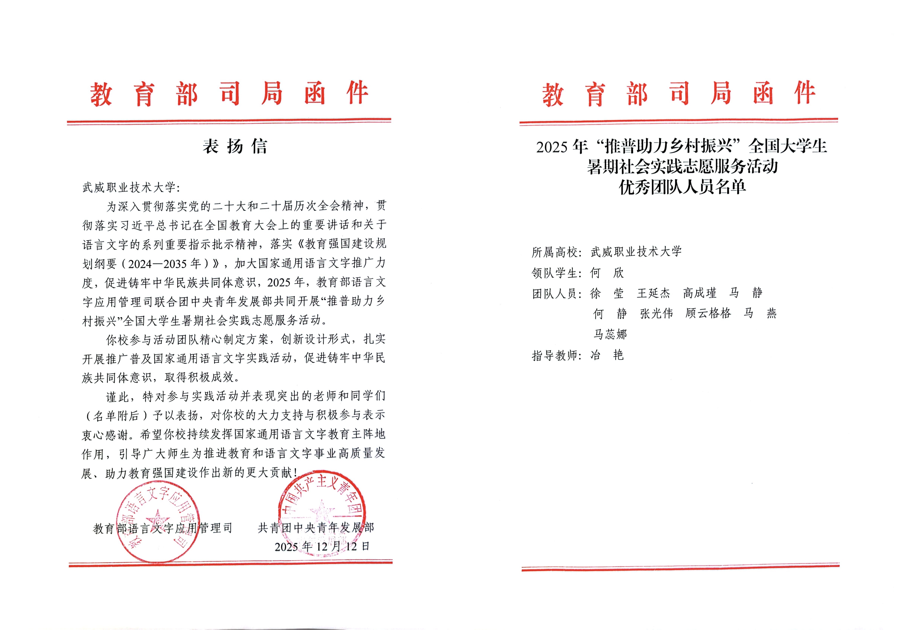 喜報(bào)!武威職業(yè)技術(shù)大學(xué)“推普助力·鄉(xiāng)村振興”暑期社會(huì)實(shí)踐團(tuán)隊(duì)獲評(píng)全國優(yōu)秀團(tuán)隊(duì)