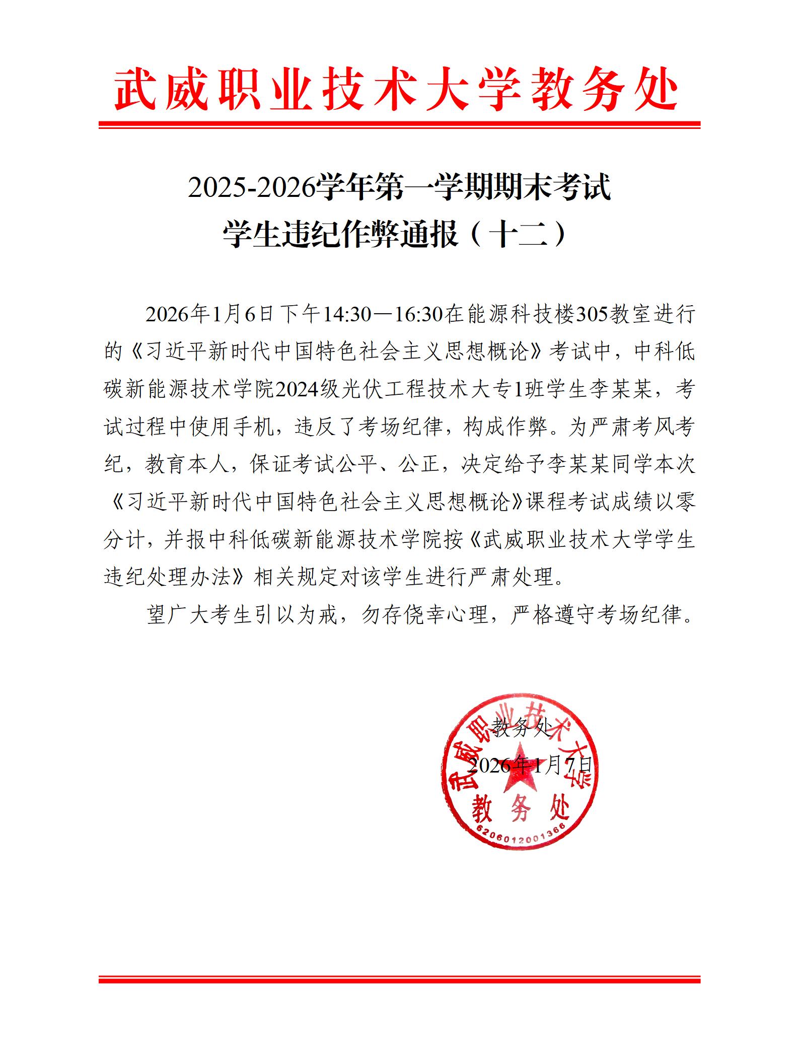 2025-2026學(xué)年第一學(xué)期期末考試學(xué)生違紀作弊通報(十二)