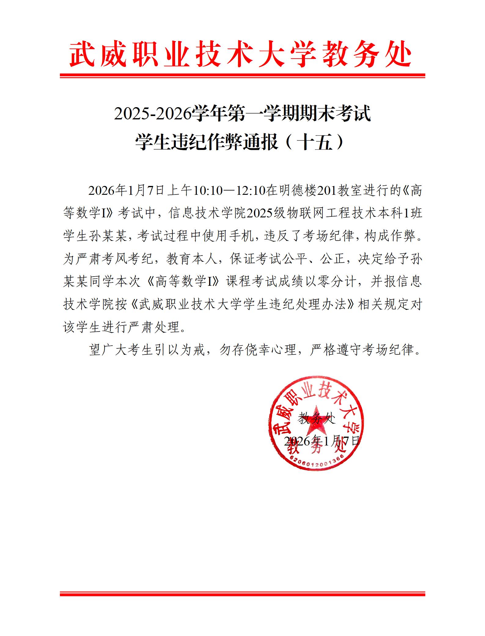 2025-2026學(xué)年第一學(xué)期期末考試學(xué)生違紀(jì)作弊通報(bào)(十五)