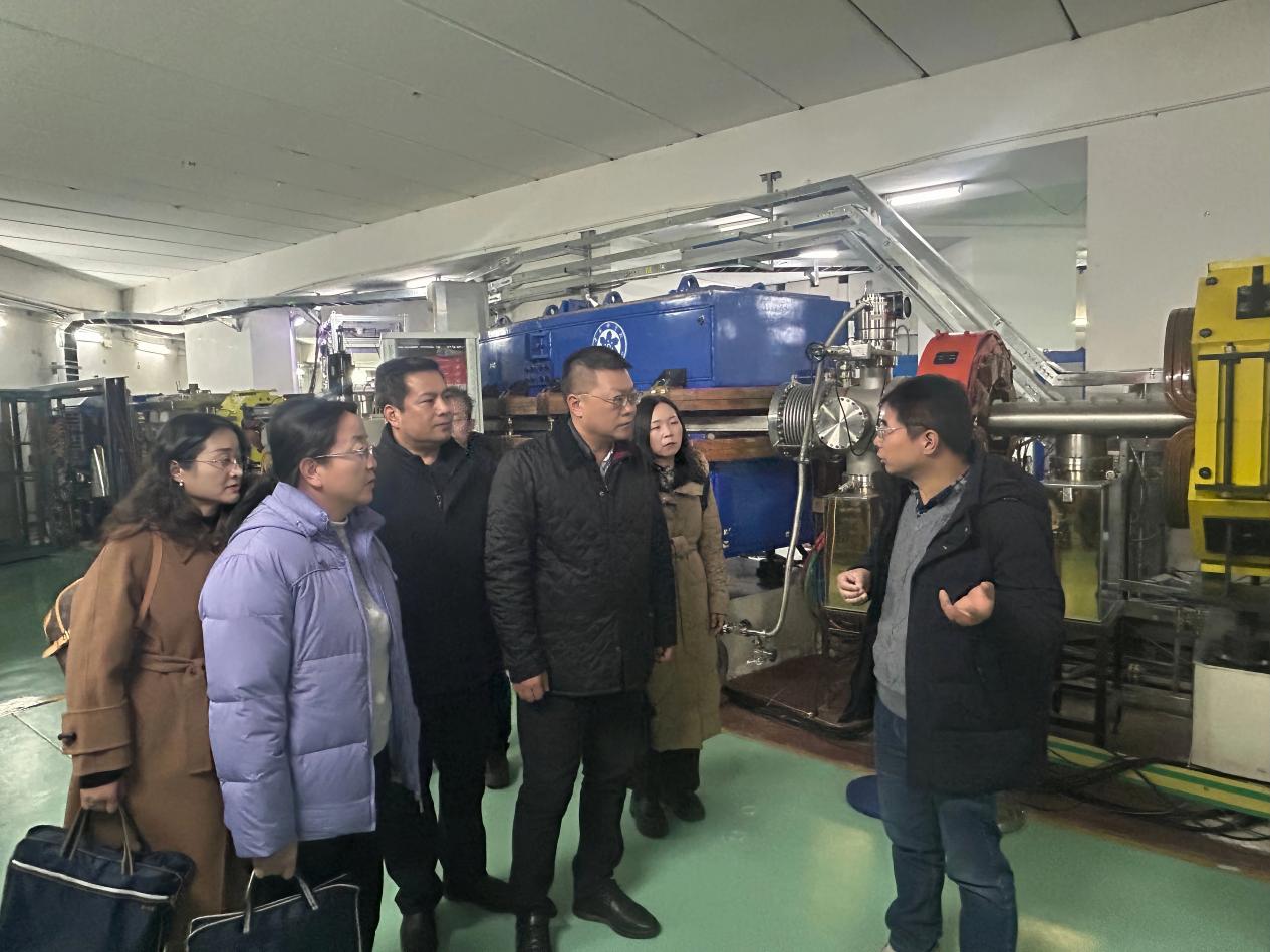 隨后,在醫(yī)用探測器室主任毛瑞士與副主任徐治國的陪同下,調(diào)研組實地參觀了“國之重器”——蘭州重離子加速器裝置,詳細了解了其結(jié)構組成、運行機制與核心技術原理。毛瑞士結(jié)合該裝置在重離子醫(yī)用探測器研發(fā)、醫(yī)用束測控制等領域的實際應用,闡釋了核探測技術對提升醫(yī)學診療精度的支撐作用,使調(diào)研組成員切身感受到大科學裝置的科技魅力與實用價值。