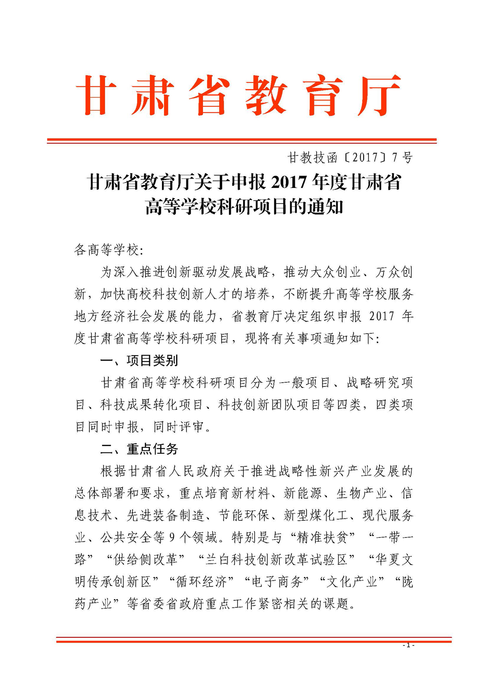 甘肅省教育廳關(guān)于申報(bào)2017年度甘肅省高等學(xué)校科研項(xiàng)目的通知